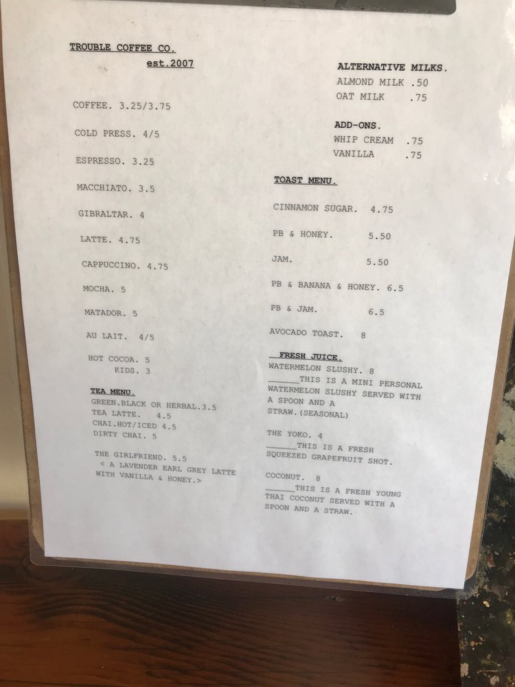 **Trouble Coffee Company** is a hidden gem in the Outer Sunset neighborhood of San Francisco. With a cozy atmosphere and friendly service, this coffee shop offers a selection of delicious coffee drinks and mouth-watering toast options. Customers rave about the peanut butter honey and brown sugar butter toast, as well as the signature sugar cinnamon toast. The coffee is described as both bright and rich, making it the perfect complement to the delectable toast offerings. The outdoor seating area is a great spot to relax and enjoy your coffee. While the service may not be ritzy, the overall experience at Trouble Coffee Company is delightful and memorable. Don't miss out on trying their lavender earl grey latte and be sure to indulge in the must-have cinnamon toast.